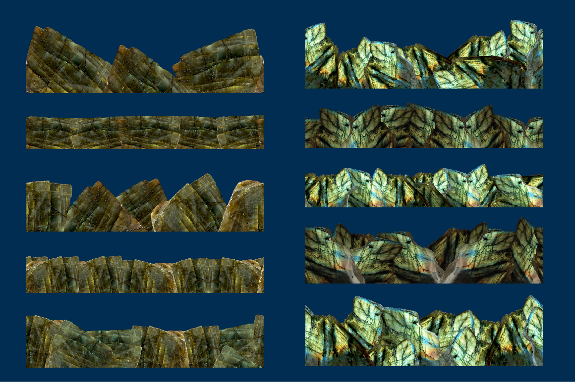 At a glance, Labradorite may appear to be an ordinary rock, but one slight tilt and this marvelous stone will reveal a flash of magic. This Gemstone Border Collection was hand selected and carefully arranged into edges and corners that are ready to use. The long edge borders are seamless and can be repeated and rotated to fit the desired placement. Line the edges of your design in the magical iridescent glow of Labradorite.