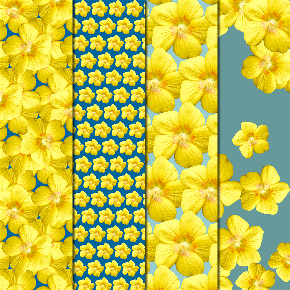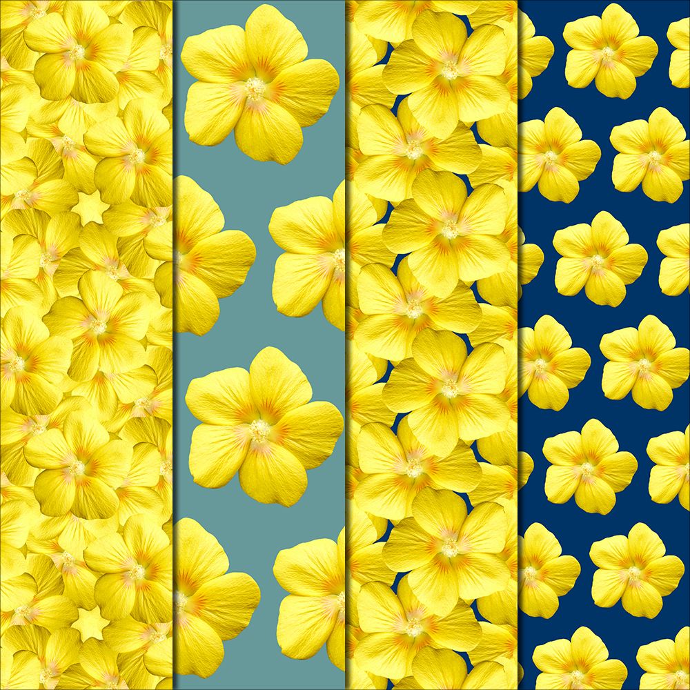 The Mallow Flower featured in these patterns flaunts bright yellow petals with a fiery burst centered around the stamen. This hibiscus like flower is super happy, it goes well with a tropical vibe- aloha! The patterns in this pack are all made with BLUE & TEAL backgrounds.