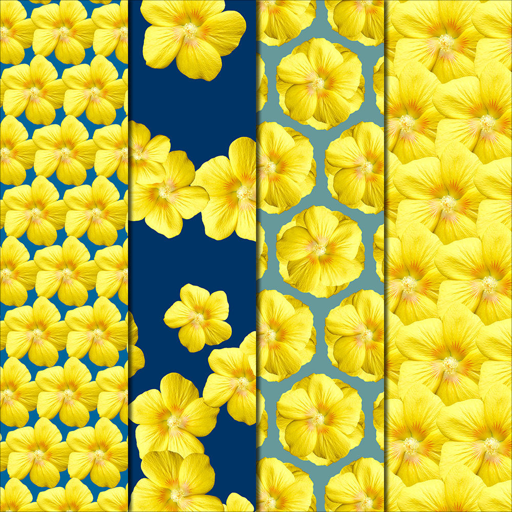 The Mallow Flower featured in these patterns flaunts bright yellow petals with a fiery burst centered around the stamen. This hibiscus like flower is super happy, it goes well with a tropical vibe- aloha! The patterns in this pack are all made with BLUE & TEAL backgrounds.