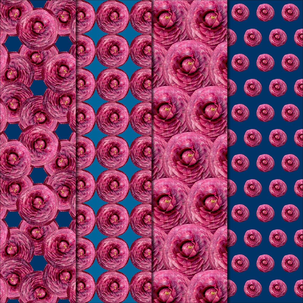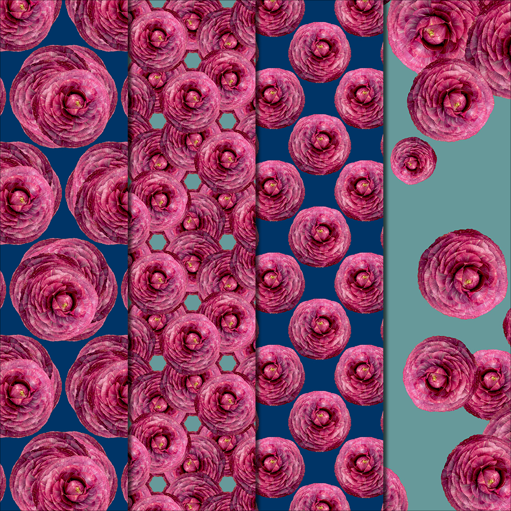 The Ranunculus Flowers featured in these patterns are fully layered with paper-thin petals. The deep pink bloom is robust yet delicate – these beauties are popping with color. The patterns in this pack are all made with BLUE & TEAL backgrounds.