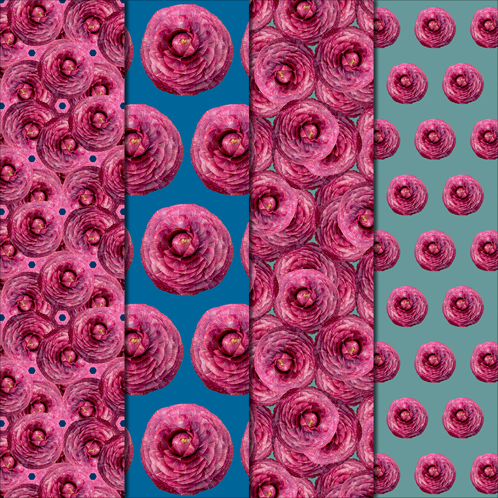The Ranunculus Flowers featured in these patterns are fully layered with paper-thin petals. The deep pink bloom is robust yet delicate – these beauties are popping with color. The patterns in this pack are all made with BLUE & TEAL backgrounds.