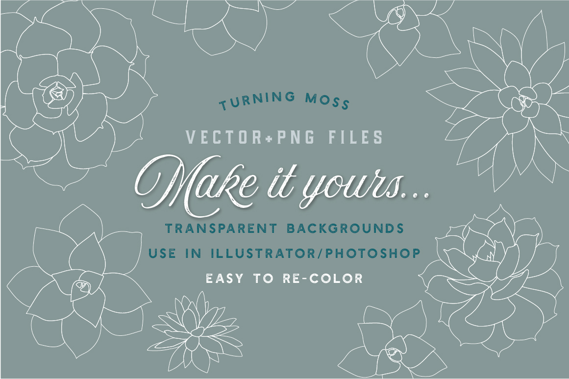 Inspired by nature, these Botanic illustrations are based off real Succulents. This clip art collection includes 6 hand drawn succulents in a variety of colors – PNG, Ai, & ESP files.