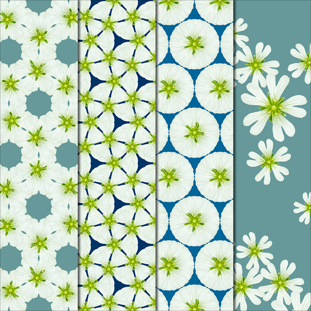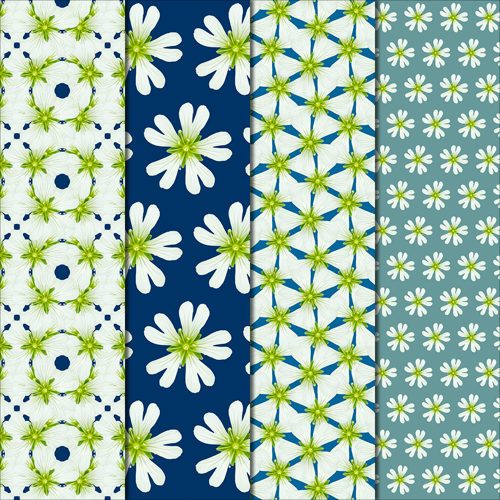 The White Wild Flower featured in these patterns has 5 heart shaped petals surrounding a lime green center. These dainty little flowers came straight from the forest to form magnificent geometric patterns. The patterns in this pack are all made with BLUE backgrounds.