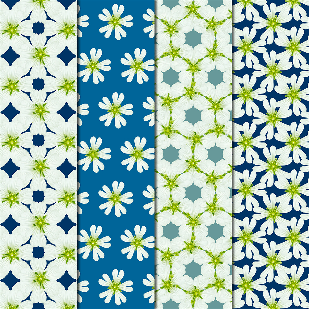 The White Wild Flower featured in these patterns has 5 heart shaped petals surrounding a lime green center. These dainty little flowers came straight from the forest to form magnificent geometric patterns. The patterns in this pack are all made with BLUE backgrounds.